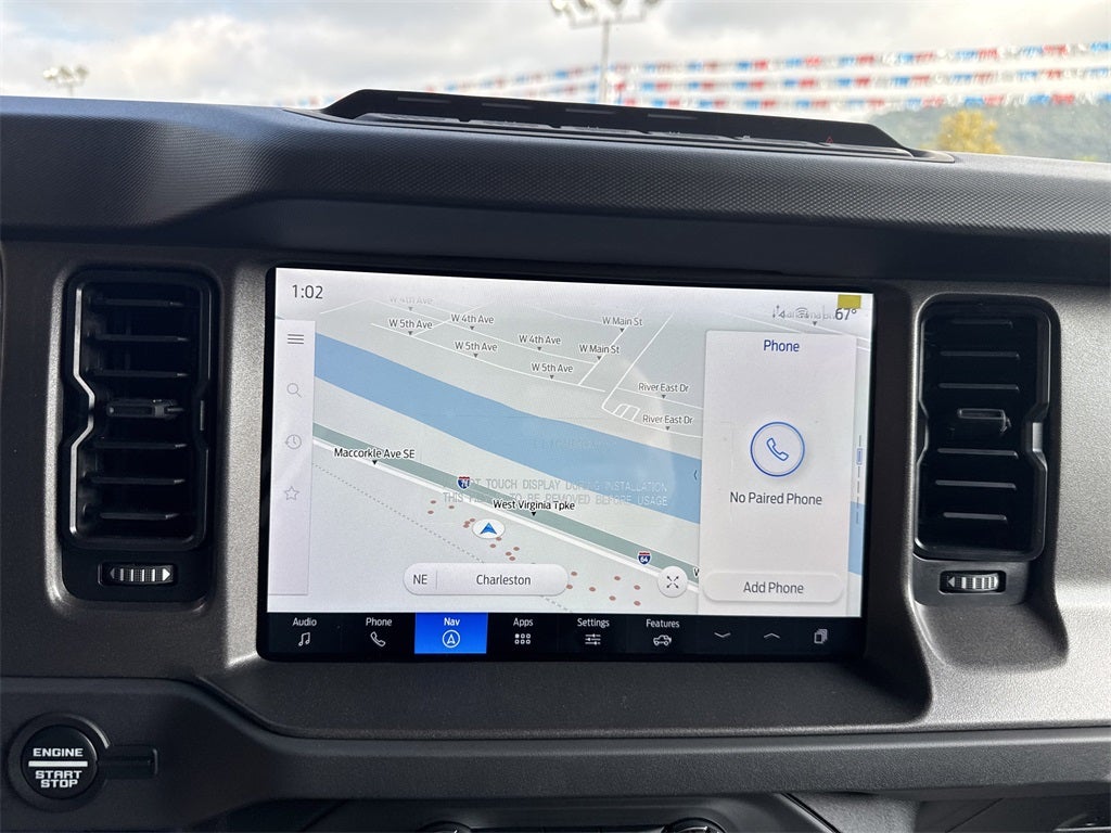 Equipment Group 332A Mid Package (2-Door Intelligent Access w/Lock/Unlock, Ambient Footwell Lighting, Connected Navigation, Dr & Pass Illuminated Sliding Visor Vanity Mirrors, Dual Smart Charging USB Ports, Dual-Zone Electronic Automatic Temperature Control, Front Row Heated Seats, Power Outlet - Back Side of Center Floor Console, and Rear Parking Sensors), 4-Wheel Disc Brakes, 4.7 Axle Ratio, 7 Speakers, ABS brakes, Air Conditioning, Alloy wheels, AM/FM radio: SiriusXM with 360L, AM/FM Stereo, Auto High-Beam Headlamps, Auto High-beam Headlights, Auto-dimming Rear-View mirror, BLIS Blind Spot Information System, Brake assist, Carbonized Gray Molded-In-Color Hard Top, Compass, Delay-off headlights, Door Storage Bags, Driver door bin, Driver vanity mirror, Dual front impact airbags, Dual front side impact airbags, Electronic Stability Control, Emergency communication system: 911 Assist, Exterior Parking Camera Rear, Ford Performance Heavy-Duty Modular Front Bumper, Front anti-roll bar, Front Bucket Seats, Front Center Armrest, Front fog lights, Front reading lights, Front wheel independent suspension, Fully automatic headlights, Heated door mirrors, Heated front seats, Heated steering wheel, Illuminated entry, Integrated roll-over protection, Internet access capable: FordPass Connect, Lane-Keeping System, Leather Shift Knob, Low tire pressure warning, Marine Grade Vinyl Heated Bucket Seats, Occupant sensing airbag, Outside temperature display, Overhead airbag, Overhead console, Panic alarm, Passenger door bin, Passenger vanity mirror, Power door mirrors, Power steering, Power windows, Pre-Collision Assist w/Automatic Emergency Braking, Radio data system, Rear-View Camera, Rear-Window Defroster & Washer, Remote keyless entry, Security system, SiriusXM w/360L, Speed control, Split folding rear seat, Steering wheel mounted audio controls, SYNC 4, Tachometer, Telescoping steering wheel, Tilt steering wheel, Traction control, Trip computer, Variably intermittent wipers, Voltmeter, and Wheels: 17 Carbonized Gray-Painted Aluminum.