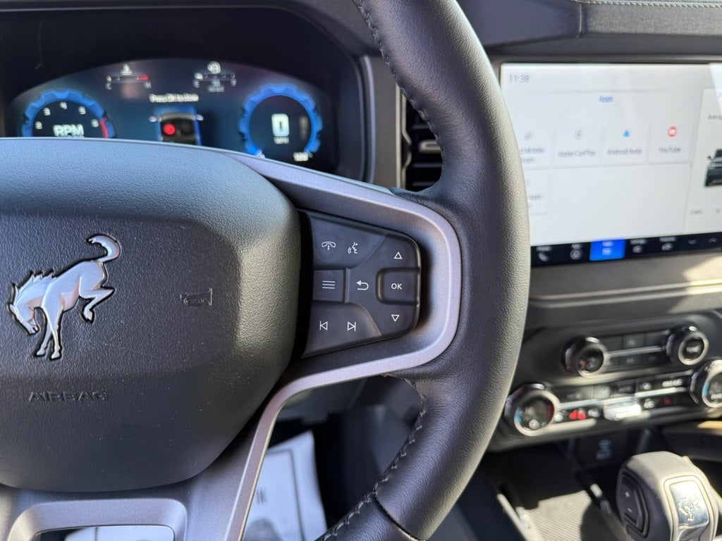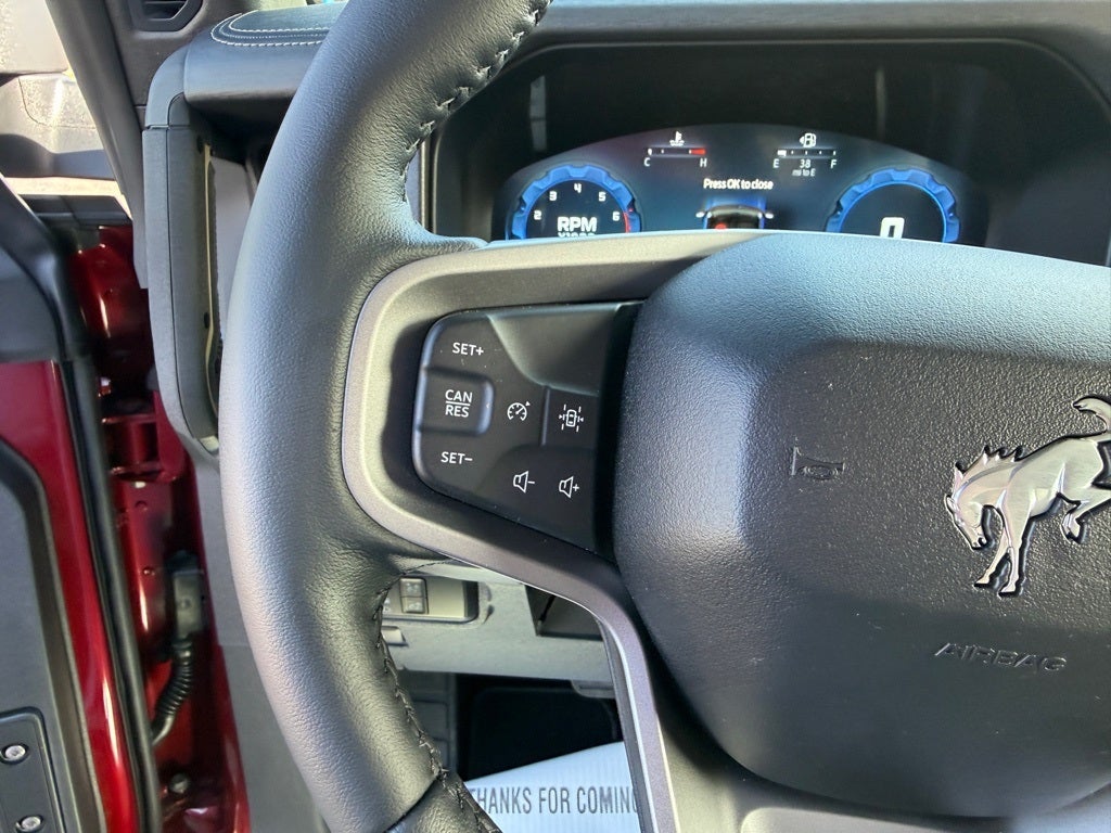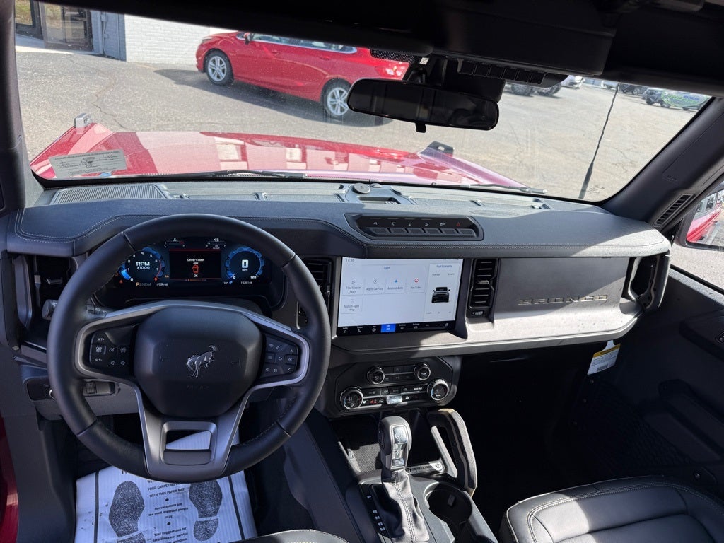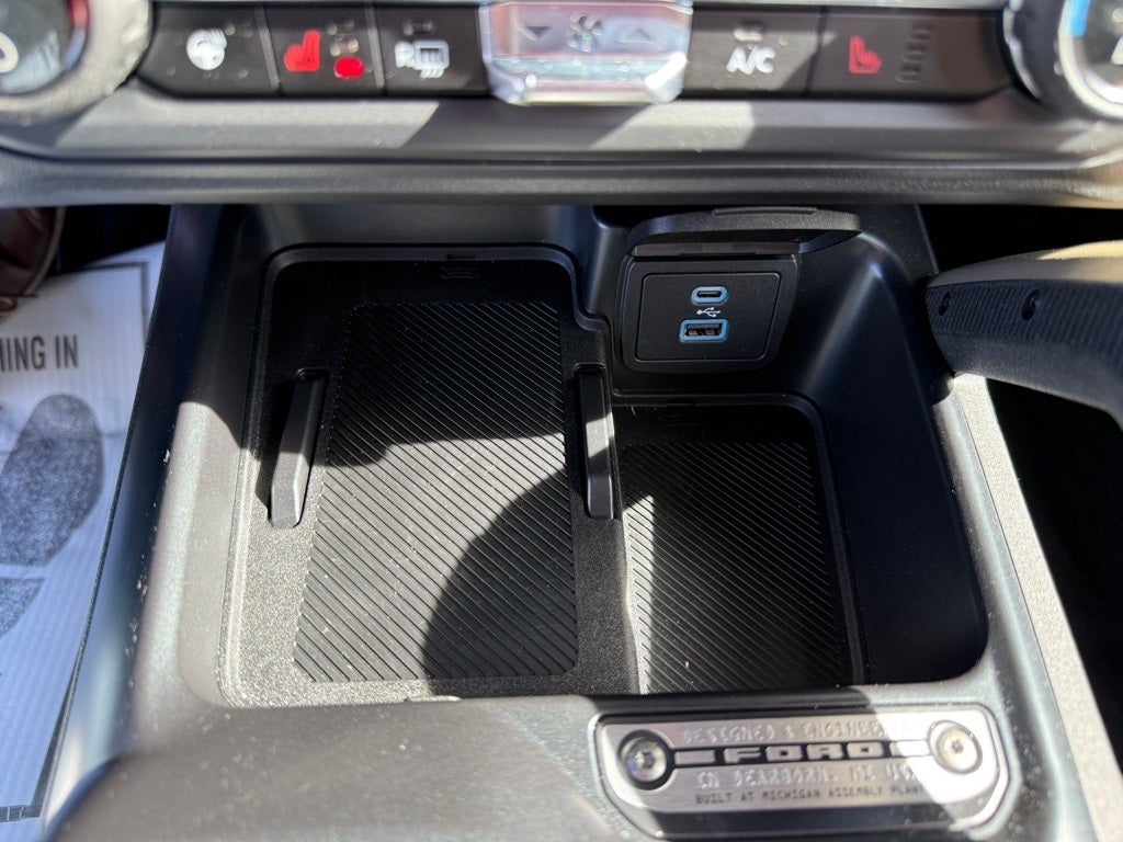 Equipment Group 332A Mid Package (2-Door Intelligent Access w/Lock/Unlock, Ambient Footwell Lighting, Connected Navigation, Dr & Pass Illuminated Sliding Visor Vanity Mirrors, Dual Smart Charging USB Ports, Dual-Zone Electronic Automatic Temperature Control, Front Row Heated Seats, Power Outlet - Back Side of Center Floor Console, and Rear Parking Sensors), 4-Wheel Disc Brakes, 4.7 Axle Ratio, 7 Speakers, ABS brakes, Air Conditioning, Alloy wheels, AM/FM radio: SiriusXM with 360L, AM/FM Stereo, Auto High-Beam Headlamps, Auto High-beam Headlights, Auto-dimming Rear-View mirror, BLIS Blind Spot Information System, Body Color-Painted Hard Top, Brake assist, Compass, Delay-off headlights, Door Storage Bags, Driver door bin, Driver vanity mirror, Dual front impact airbags, Dual front side impact airbags, Electronic Stability Control, Emergency communication system: 911 Assist, Exterior Parking Camera Rear, Front anti-roll bar, Front Bucket Seats, Front Center Armrest, Front fog lights, Front reading lights, Front wheel independent suspension, Fully automatic headlights, Hard Top Sound Deadening Headliner, Heated door mirrors, Heated front seats, Heated steering wheel, Illuminated entry, Integrated roll-over protection, Internet access capable: FordPass Connect, Lane-Keeping System, Leather Shift Knob, Low tire pressure warning, Marine Grade Vinyl Heated Bucket Seats, Occupant sensing airbag, Outside temperature display, Overhead airbag, Overhead console, Panic alarm, Passenger door bin, Passenger vanity mirror, Power door mirrors, Power steering, Power windows, Pre-Collision Assist w/Automatic Emergency Braking, Radio data system, Rear-View Camera, Rear-Window Defroster & Washer, Remote keyless entry, Security system, SiriusXM w/360L, Speed control, Split folding rear seat, Steering wheel mounted audio controls, SYNC 4, Tachometer, Telescoping steering wheel, Tilt steering wheel, Traction control, Trip computer, Variably intermittent wipers, Voltmeter, and Wheels: 17 Carbonized Gray-Painted Aluminum.