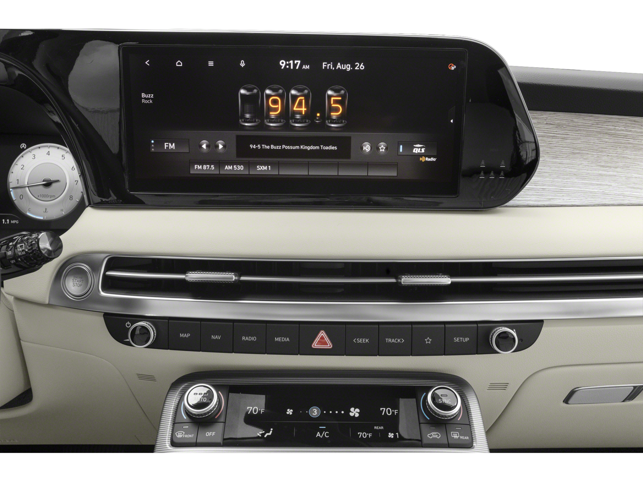 - Radio: AM/FM/MP3 Premium Audio System -inc: 630-Watts, 12.3" color touchscreen display, onboard navigation w/traffic flow including incident data via HD Radio (HERE), Over-the-Air (OTA) map updates, Harman Kardon audio system w/12-speakers, Quantum Logic Surround, Clari-Fi, SiriusXM, Android Auto and Apple CarPlay, USB, dynamic voice recognition, rear seat quiet mode, passenger talk (in-car intercom), Bluetooth hands-free connectivity w/multiple device connection and Bluelink Connected Car System